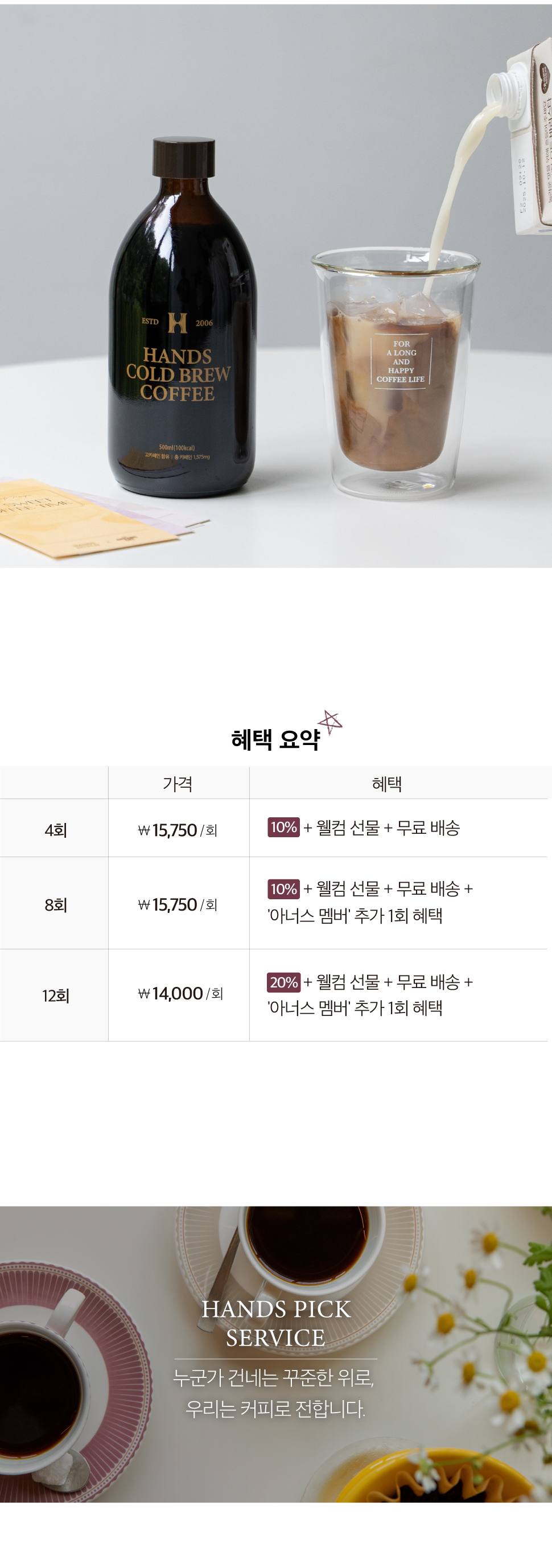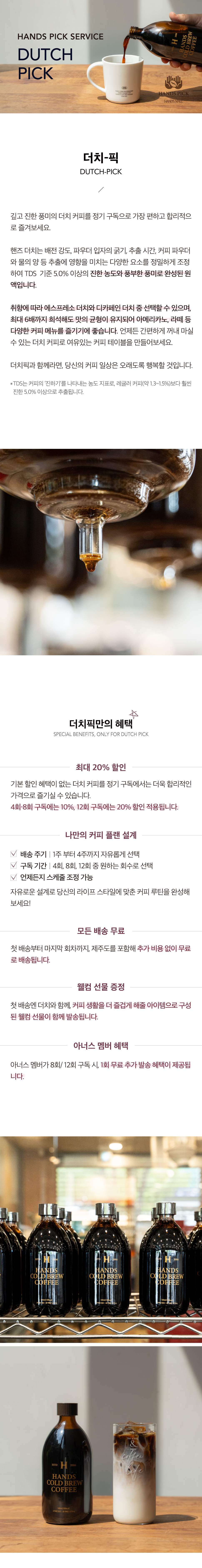 • 핸즈몰의 원두와 더치는 주문 접수 후, 즉시 로스팅하고 생산하여 타 소비자에게 재판매되기 어려우므로 발송 후에는 교환 및 반품이 불가합니다.