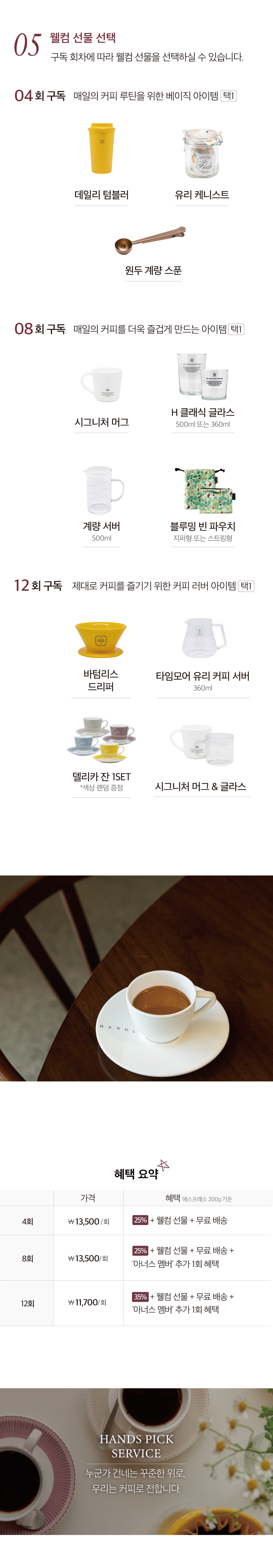 • 핸즈몰의 원두와 더치는 주문 접수 후, 즉시 로스팅하고 생산하여 타 소비자에게 재판매되기 어려우므로 발송 후에는 교환 및 반품이 불가합니다.