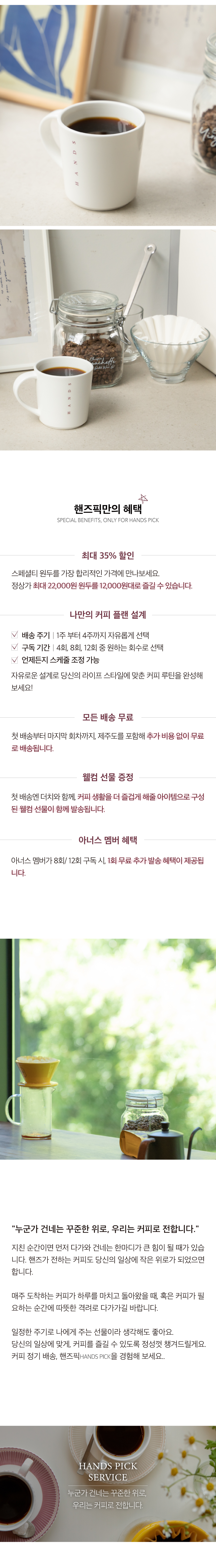 • 핸즈몰의 원두와 더치는 주문 접수 후, 즉시 로스팅하고 생산하여 타 소비자에게 재판매되기 어려우므로 발송 후에는 교환 및 반품이 불가합니다.